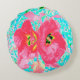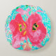 Zwei Rosy Red Coral Pum Crazy Hibiskus auf Aqua Rundes Kissen