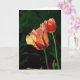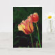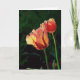 Innere Aufschrift (kann geändert werden oder gelöscht werden): "Die Freude Mai-Natur erhellen Ihren Tag!" Ein Paar Papageientulpen mit den glänzenden roten Blumenblättern erreichen für das Morgenlicht.