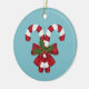 Desteis originelle Illustration von zwei rot-weiß gestreiften Weihnachtskandinken-Leckereien mit einem roten Bogen und einer Weihnachtsheiligen / Gemeinen heiligen Pflanze. Die Hintergrundfarbe ist blau. Auf der anderen Seite gibt es zwei personalisierbare Textbereiche.