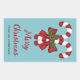Desteis originelle Illustration von zwei rot-weiß gestreiften Weihnachtskandinken-Leckereien mit einem roten Bogen und einer Weihnachtsheiligen / Gemeinen heiligen Pflanze. Die Hintergrundfarbe ist blau. Es gibt auch zwei personalisierbare Textbereiche.