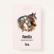 Benennen Sie Abzeichen mit einem Bild mit einem Pferdepaar. Tragen dekorativer Headbands. Umgeben von Federn und Blättern.