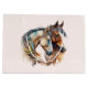 Geschenktasche mit einem Bild mit einem Paar Pferde. Tragen dekorativer Headbands. Umgeben von Federn und Blättern.