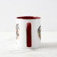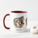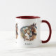 Eine Tasse mit einem Pferdefoto. Tragen dekorativer Headbands. Umgeben von Federn und Blättern.