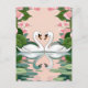 Das Bild zeigt zwei Schwäne, die in einem Teich mit rosa Blume im Hintergrund schwimmen. Die Schwäne stehen sich gegenüber und ihre Hals sind in einer Herzform verstrickt. Der Teich ist von Lilienpläden und Wasserlilien umgeben. Der Himmel ist eine weiche rosa Farbe mit Wolken im Hintergrund. Die allgemeine Stimmung des Bildes ist romantisch und friedlich.