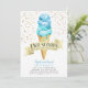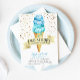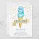 Niedliches Eis Thema Geburtstagsfeier des Twin Jungen Einladung Karte mit Aquarellbild von blauen Eis auf Waffelkonus. Es gibt Imitate, die mit Goldsprinklen umherspringen. Der Text im Banner sagt: "Zwei Scoops sind besser als eine." Ideal zum Geburtstag eines Jungen im Sommer.