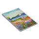 Zwei Segelboote und Hütte I von Karen Fields. Helle, lustige Szene mit Blume, Bäumen, einer Hütte und Segelbooten auf dem Wasser.