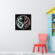 Zwei stilisierte Schlangen, eine weiß und eine schwarz, verwoben in einer kreisförmigen Zusammensetzung. Die Schlangen sollten heftige Ausdrücke haben und von verzierten Blumenmotiven in sanften Blau- und Rosatönen umgeben sein. Der Hintergrund sollte dunkel sein, die lebendigen Farben verbessern und ein kosmisches Gefühl geben, das die Themen Dualität und Ausgewogenheit widerspiegelt.