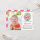 Dieses niedliche Wassermelonthema lädt ein zum zweiten Geburtstag eines kleinen Mädchens, das diesen Sommer zwei Jahre alt wird. Ersetzen Sie das Beispiel-Foto auf der verlassen Kartenhälfte einfach durch das Foto Ihres Kindes. Auf der rechten Hälfte erscheinen die Worte "Two Sweet!" in Weiß auf einem runden Aquarellrosa und einer grünen Wassermelone. Fügen Sie den Namen des Geburtstagsmädchens in rosa Schrift und Party Details in schwarz Sans Serif Schriftart. Rosa und grüne Konfetti schmücken die links und rechten Kanten. Die Rückseite weist ein sich wiederholendes Muster des gleichen Aquarellmotivs auf weißem Hintergrund auf.