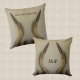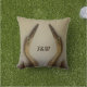 Zwei verwitterte Holzhelden stehen auf der einen Seite zueinander und zeigen auf der anderen Seite dieser thematischen Kissen an der Küste abseits. Das Design basiert auf einer alten Holzschnitzerei eines Seevögels. Diese sandfarbenen, beige und blassneutralen Kissen können mit Initialen oder Namen individuell gestaltet werden. Sie haben eine rustikale natürliche Anziehungskraft, ideal für eine Seehütte, Hütte am Meer oder Zuhause am Strand. Dieses Bild ist eine Originalfotografie von JLW_FOTOGRAFIE.