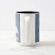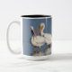 Tasse mit zwei weißen Pelikanen, die aussehen wie eine, spricht mit dem anderen. Beide sind in blauem Wasser stehend und im Wasser mit weißen Reflexen versehen.