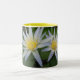 Zwei weiße Wasserlilien mit prächtigen gelben Mittelpunkten. Die perfekte Kaffee- oder Teezubereitung für jemanden, der Blume Lieben hat.
