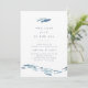Unsere schicke Sommerfreunde-Party in der Küstenregion bieten ein kissendes Paar blaue Aquarellfische, die mit einer Schule von kleineren Fischen am Boden brechen. "Zwei weniger Fische im Meer" erscheint in elegantem marineblauen Buchstaben mit den Details Ihrer Verlobungsparty darunter.