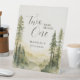 Christliche Hochzeitsschrift mit personalisiertem Podest mit inspirierender Zitatskriptur zeigt eine wunderschöne Naturwasserfarbe mit einem Bach, umgeben von einem Wald aus Kiefern und Bergen. Es enthält Bibelverse, "Zwei werden eins" und die Namen des Paares.