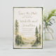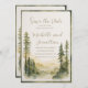 Christliche Hochzeit Save the Date-Karte mit inspirierender Zitat-Schrift zeigt ein schönes gerahmtes, einfaches naturfarbenes Design mit Waldkiefern und Bergen in Erdtönen von Salbei, dunkelgrün und Bräune. Es zeigt die Einführung der Bibel Verse: "Und die beiden werden eins."