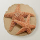 Zwei große Zuckerstarfish auf einem glatten sandigen Strand.
