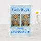 Zwei niedliche kleine Teddys mit blauen Bögen auf Gingham Hintergrund und der Text Twin Boys Many Gratulation!