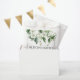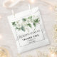 Diese stilvolle Gastgeschenk Hochzeit-Tasche hat einen Zweig mit weißen Blume und Blätter in Salbei grün. Die Namen der Paare werden in dekorativer Typografie angezeigt, während auch die Nachricht "Danke" enthalten ist. Um das Aussehen zu vervollständigen, ist ein stylischer schwarzer, dünner Rahmen angelegt.