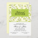 Die Probe-Dinner-Einladung zeigt die Farben Kalkgrün und Hellgelb. Der Hintergrund der oberen Hälfte sind die Verzweigungen grüner Blätter mit hellgelbem Hintergrund. Eine grüne Kiste in der Mitte der Blätter hat anpassbaren Text, der lautet: Probe Dinner. Die untere Hälfte ist weiß und enthält einen anpassbaren Text für die Details des Abendessens.