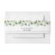 Diese elegante Blumen-Hochzeitseinladung zeigt eine Anordnung von Zweigen, die mit zarten weißen Blume und schlängelgrünen Blätter am oberen Teil geschmückt sind. Die Namen des Ehepaares werden in dekorativer Typografie hervorgehoben dargestellt, was dem Design eine Touch der Eleganz verleiht. Ein schwarzer Rahmen am unteren Rand fügt der Ästhetik ein subtiles, aber stilvolles Element hinzu.