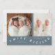 Whimsikale Geburtsankündigungskarte mit Typografie-Text, der unten "zweimal gesegnet" mit zwei Fotos auf der Vorderseite steht. Sie können ein 3. Bild auf der Rückseite zusammen mit den Geburtsstatistiken und der Botschaft hinzufügen. Der Hintergrund ist blau.
