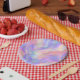 Der Stil der 2000er Jahre. Holo-Imitate-rieszierende abstrakte Wellen in sanften tropischen Farben.