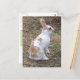 Ein gesprenkeltes Kaninchen sitzt auf der Acht, während sein Foto genommen wird.