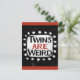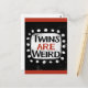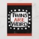 "Twins Are Weird" ist ein niedliches Textdesign in schwarz mit schwarzem und rotem Text, zusammen mit einer weißen Akzent-Form und weißen texturierten weißen, weißgetönten weißen Punkten, die ihn umgeben.