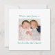 Das moderne minimalistische Design ist vollständig anpassbar und bietet Ihnen die Möglichkeit, die Begeisterung durch die Ankunft Ihrer Zwillinge zu verdoppeln. Ihr Foto ist in einem quadratischen Format in der Mitte, mit viel weißem Raum umgeben für eine zeitgenössische Touch. Personalisieren Sie den Text auf der Vorder- und Rückseite einfach mit Ihren eigenen, einschließlich aller Details Ihrer kleinen Freudenbündel auf der Rückseite, und ersetzen Sie einfach das Beispiel-Foto im Vorlagenplatzhalter. Sie können auch Hintergrund- und Textfarben auf beiden Seiten ändern, wenn Sie dies über eine weitere Anpassung wünschen.