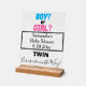 Zwei Babys sind auf dem Weg ist in schwarzer Typografie geschrieben (geben Sie für Triplet, Quadruplet ein). Junge oder Mädchen ist in hübscher blau-rosa Typografie geschrieben. Fügen Sie Mama-to-be Name und Baby Shower Date in schwarz kursiv in das geometrische schwarze Rechteck ein. Hintergrund löschen Elegante Tafelanzeige. Entwürfe von TamiraZDesign.