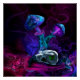 Lebhafte, surreale Traumwelt mit Pilzen, Vogelschädel und viel Tiefe und Dimension, die den Betrachter mit dem Wunsch verlasse, verschiedene Bereiche und Dimensionen zu erkunden.