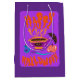 Original Illustration eines Halloween Cat Liebhabers Hexe Tasse Kaffee, Zauberstab, Tränke, niedliche winzige Geister, Kürbis und fliegende Fledermaus mit handgeschriebenem Sprichwort Happy Halloween. In modernen, hellen Farben mit lila und orangefarbener lustiger Darstellung für Kinder.
