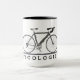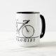 Radfahrer in weißem Text auf schwarz mit dunkelgrauem Fahrrad auf grauer Linie.